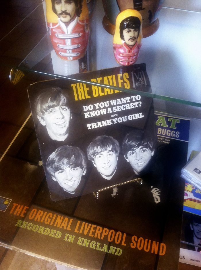 Under glass, there’s a copy of “The Beatles vs. The Four Seasons.” It was released by Chicago-based Vee Jay Records in the fall of 1964 just as the label’s rights to release Beatles material was expiring. Because it repackaged material from both acts that had already been available widely, it was mostly ignored by the public and quickly sank out of print. The sight of one is known to drive serious collectors into fits of envy.