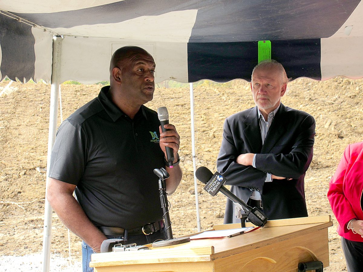 Sterling Crockett, chief executive officer of AGRiMED Industries, speaks at a groundbreaking ceremony for the medical marijuana growing operation being built in Cumberland Township. At his side is Steelers Hall of Fame linebacker Jack Ham, who works for AGRiMED.