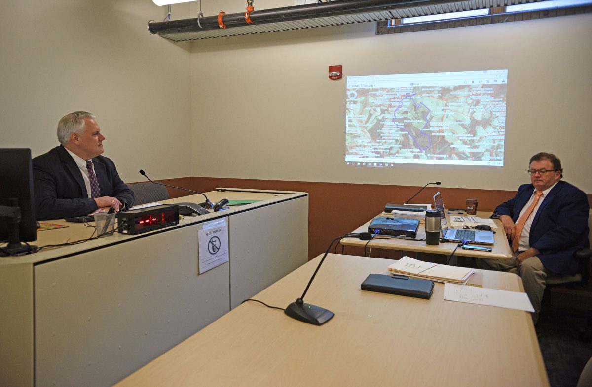 Joseph M. Zupancic, left, court-appointed master for tax assessment appeals, and Washington County Tax Revenue Department solicitor Blane Black await the start of a conciliation conference.