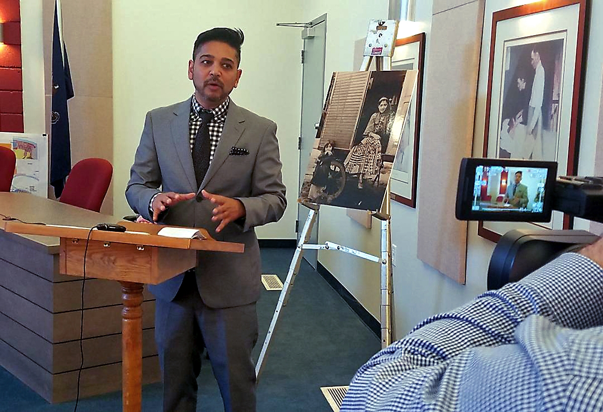 George Eli of Romani Media Initiative speaks in California Borough before the screening of a film about discrimination against Romas in Europe.