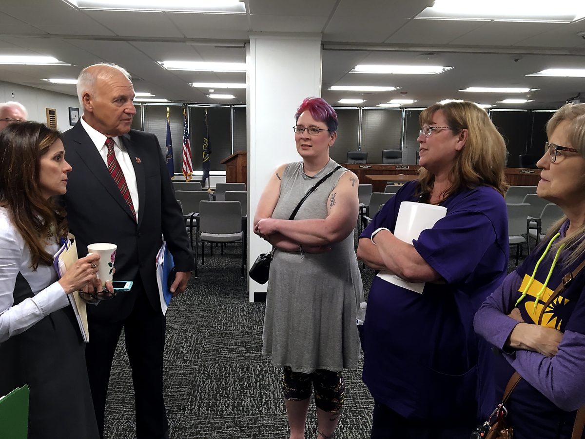 Washington County Commission Chairman Larry Maggi and Vice Chairman Diana Irey Vaughan discuss the pending sale of the Washington County Health Center with employees of the 288-bed facility after a commissioners meeting.