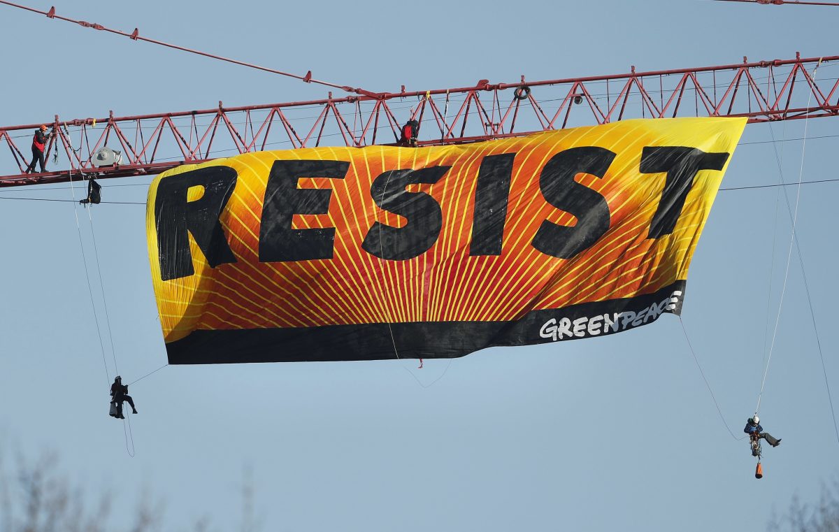 Greenpeace protesters unfurl a banner that reads “Resist” at the construction site of the former Washington Post building, near the White House in Washington Wednesday after police say protesters climbed a crane at the site refusing to allow workers to work in the area.