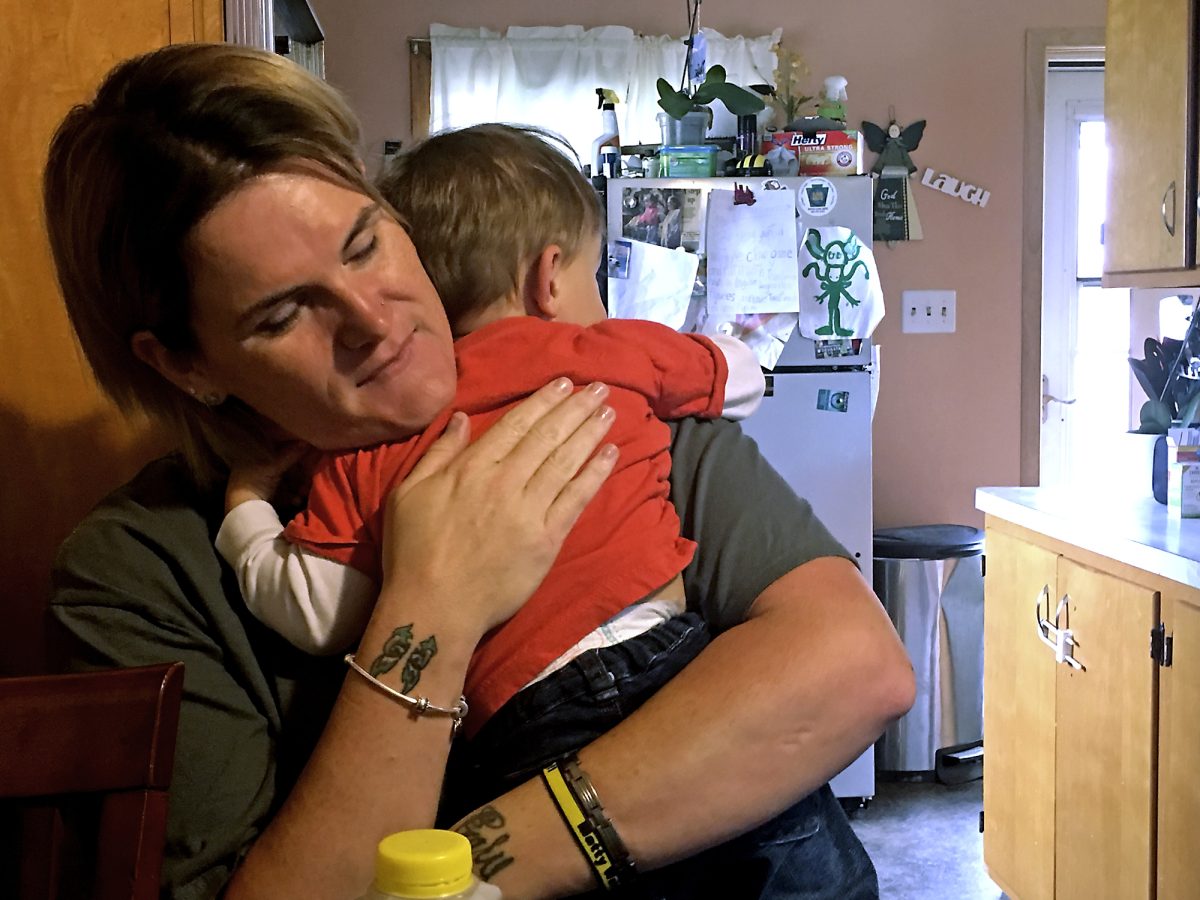 His “Mama,” Erin Spangler, scoops him up and gives him a kiss.