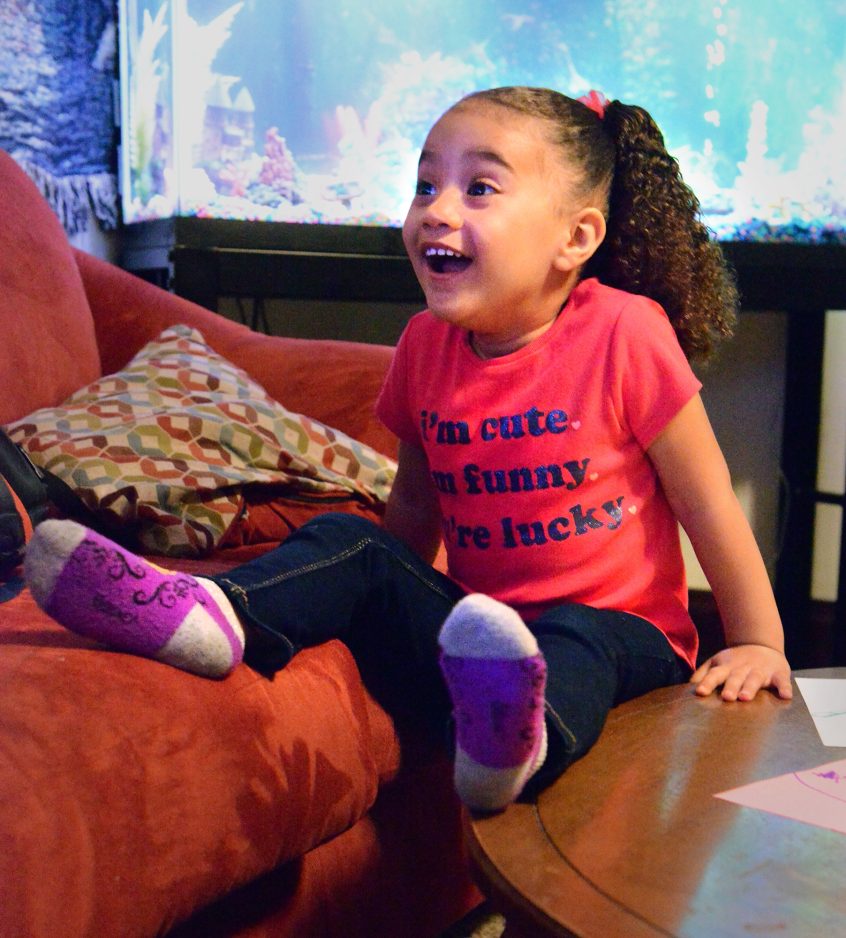 Lowry holds a construction paper turkey with “I’m thankful for Nana” written in crayon, while Bailey dances and her brother shakes a tin of mints like a maraca.