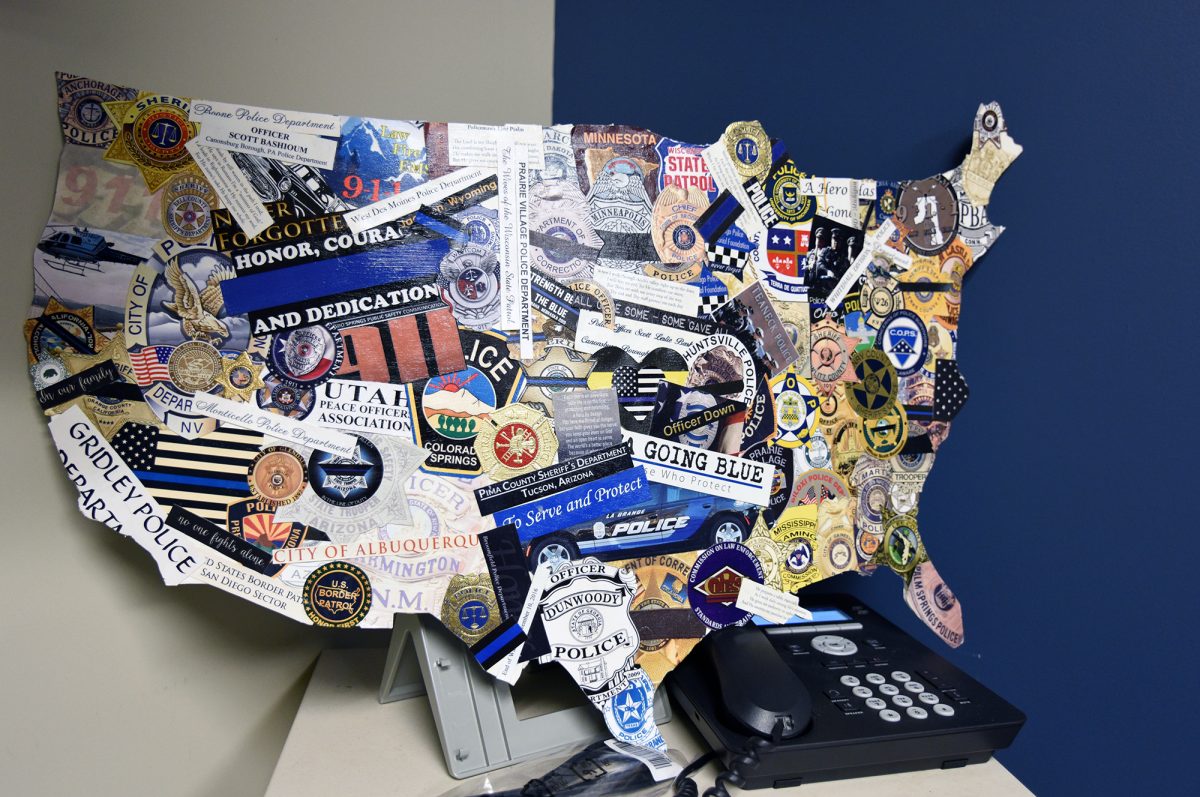 Lori Sheldon, the department’s secretary, helped tremendously in the hours, days and months after the shootings, “keeping (the department) together,” he said. She also made a collage of some of the cards sent from across the country on a cutout of the United States.