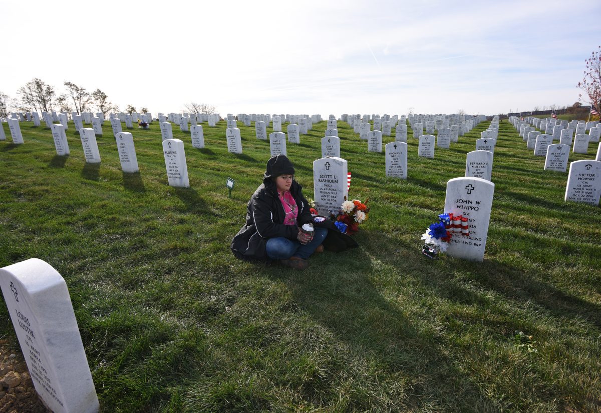 Faren Bashioum of Muse sits by her father’s grave before the Veterans Day ceremony at National Cemetery of the Alleghenies in Cecil Township Saturday.