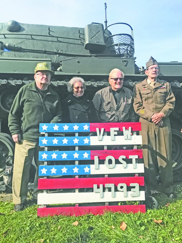 VFW Post 4793 on Lincoln Street in Waynesburg served lunch Saturday after the Veterans Day parade. Afterward, four of the oldest veterans in attendance stepped outside for a photo with the post’s World War II tank. From left, Navy Sea Bees John Mooney, 89, who served in both World War II and Korea, and World War II veterans, U.S. Army Nurse Helen “Jean” Gusic, 93, stationed in Okinawa, Japan, after World War II and U.S. Army veteran Russell Haines, 90, who was stationed after the war in the Nazi’s infamous Eagles Nest in the Alps. John Coke, 86, still fits into his Korean War Army uniform and wore it proudly in Saturday’s parade.