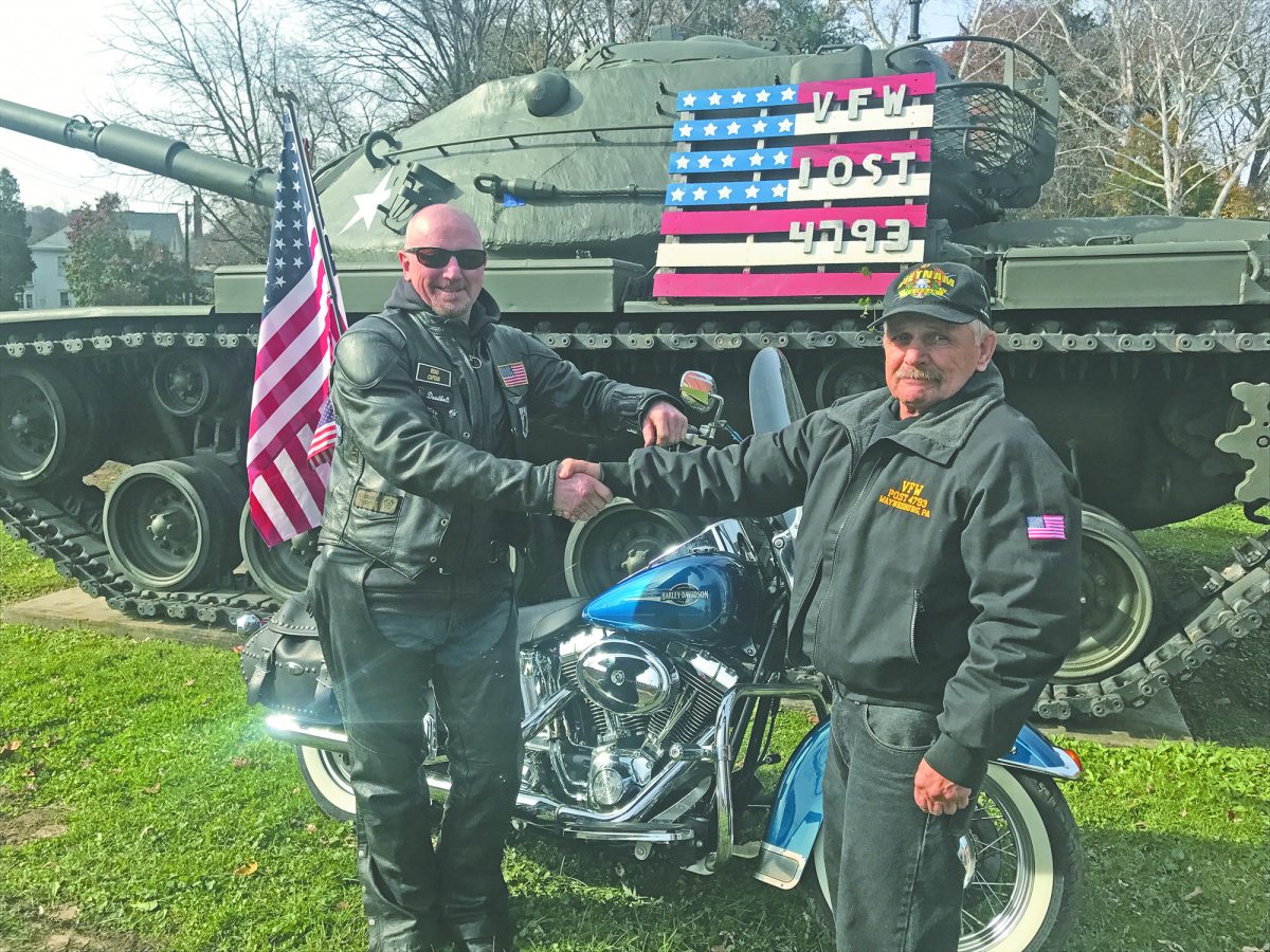 U.S. Marine and Army veteran Ed Debolt, left, and Vietnam veteran Rick Black, Senior Vice President of VFW 4793, got together for lunch and camaraderie at the post Saturday. DeBolt rode in the Waynesburg Veterans Parade that morning as president of the American Legion Post 816 Riders.