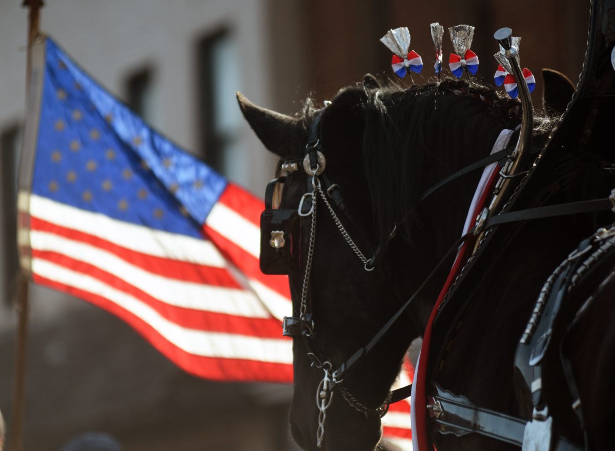 A percheron pulling the 84 Packing wagon walks in the Veterans Day Parade in Monongahela.