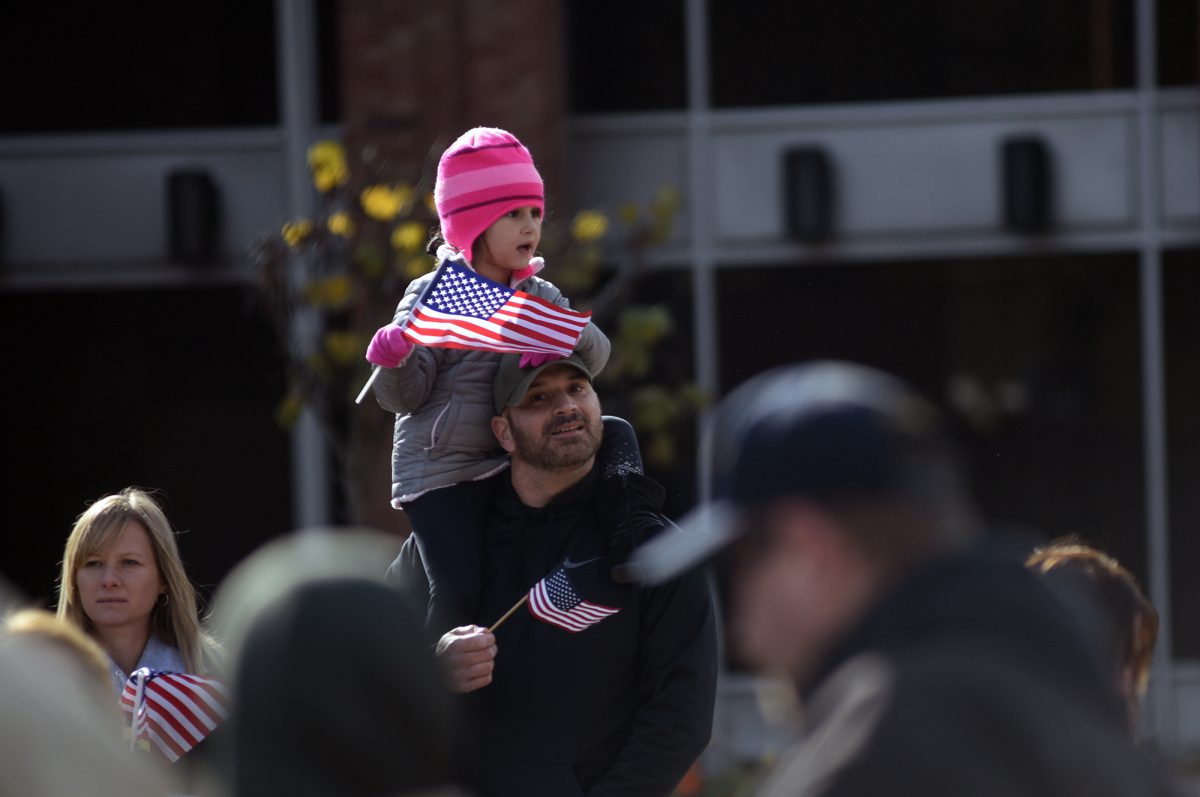 Emily Massafra, 4, and her parents Kim and Brett of Donora watch the Veterans Day parade in Monongahela.
