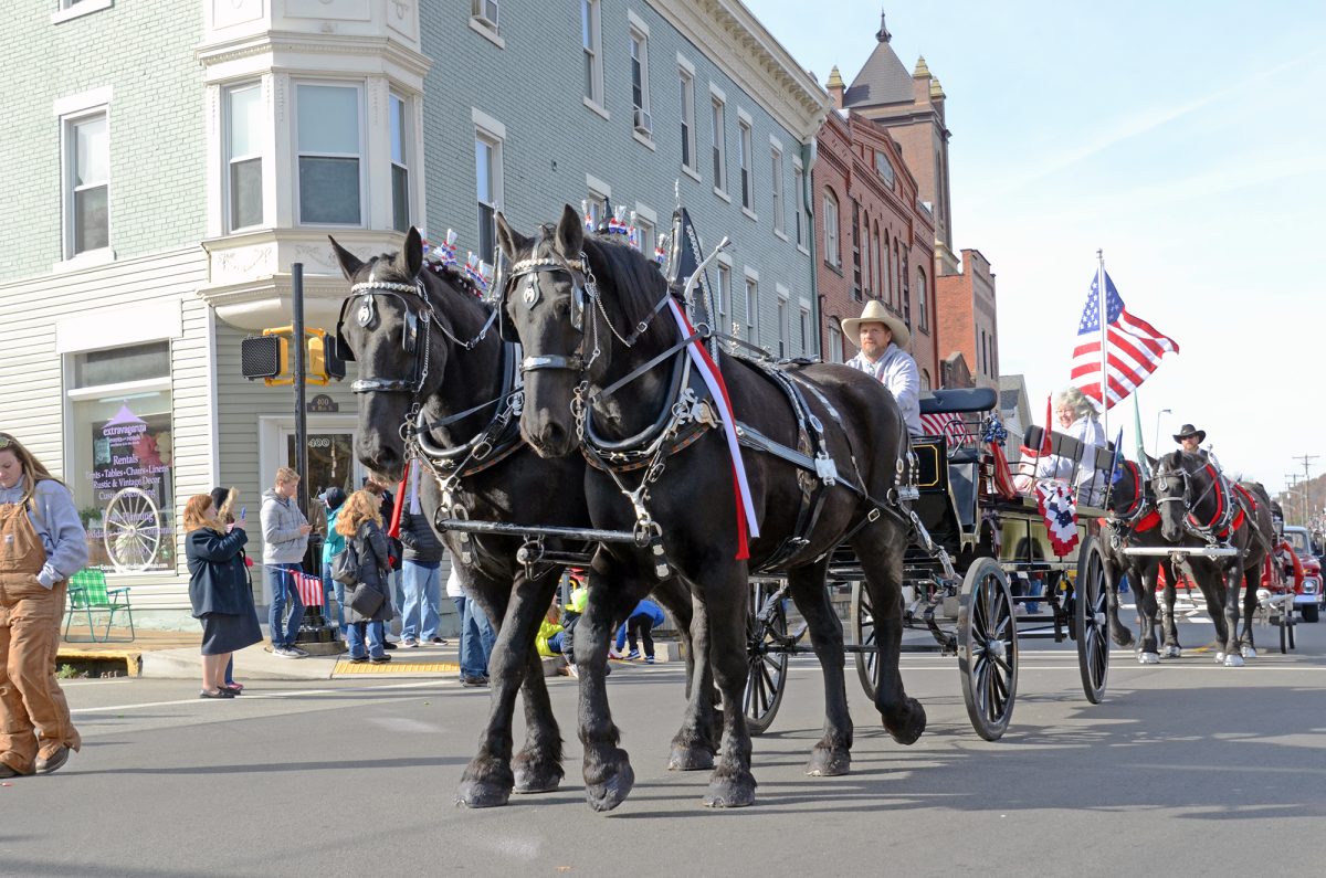 Horse drawn carriages make their way down Main Street in Monongahela for the Veterans Day parade.