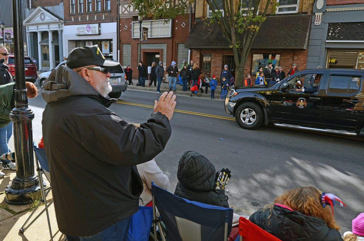 Boleslaw Jankowski, a Vietnam veteran, waves as members of a service group pass during the Veterans Day parade in Monongahela.