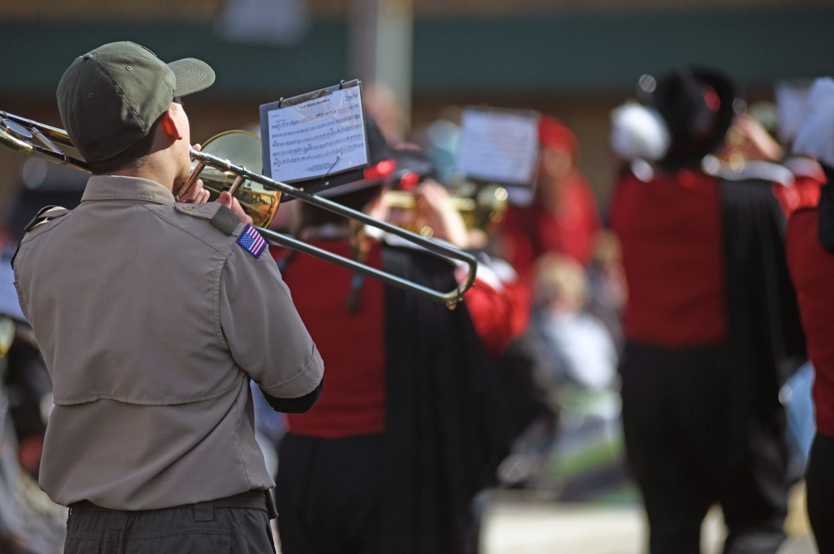 A Charleroi High School band member wears his Boy Scout uniform while playing with the band in the Veterans Day parade in Monongahela.