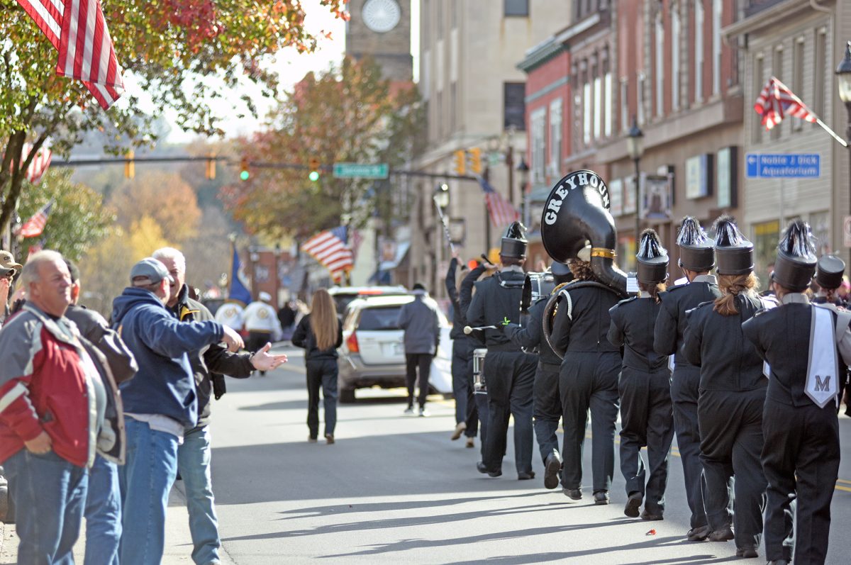 Monessen High School’s marching band makes its way along the parade route in the Veterans Day parade in Monongahela.