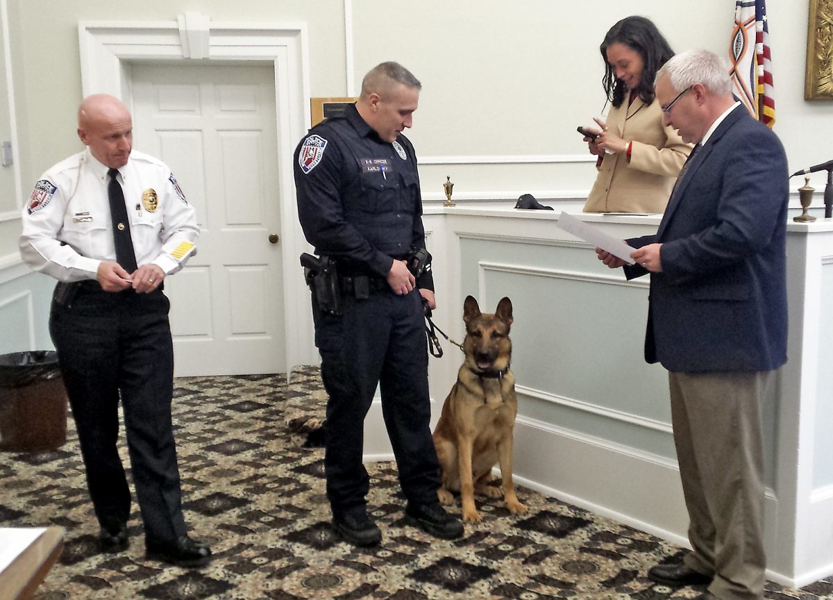 Washington police Officer Matthew Karlowsky stands with new K9 officer Tony, a 1-year-old Dutch shepherd mix, just after the dog was sworn in Thursday afternoon at City Hall.