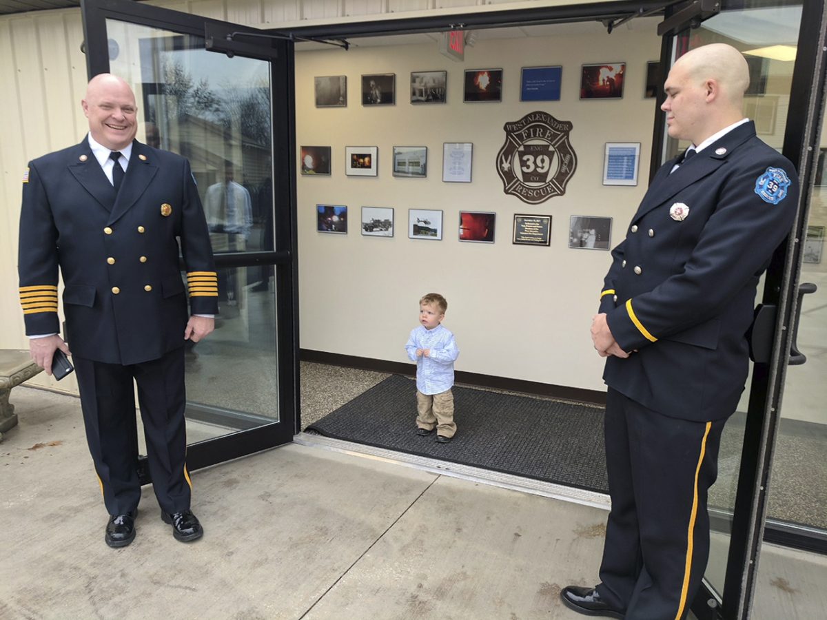 West Alexander fire Chief Eric Graham, left, and firefighter/EMT Levi Graham hold the doors of the new breezeway for Mason Scherich, 2, son of fire Capt. Shawn Scherich.