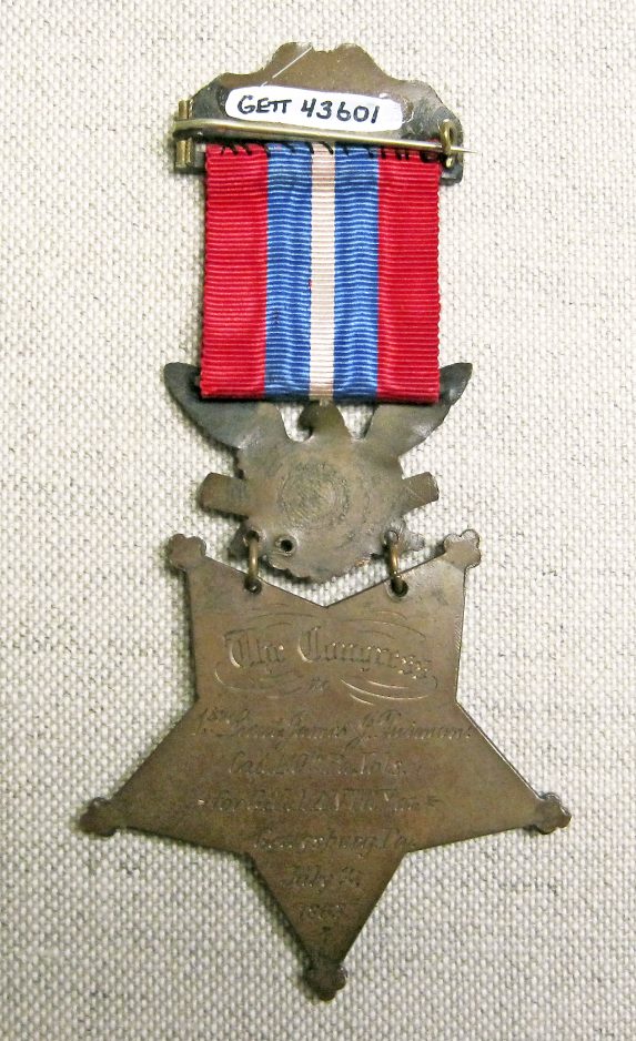 As the fighting continued the next morning, Purman was wounded once again when a minie ball struck his right leg. Injured and needing water, Purman called out to the nearby Confederates for help. A lieutenant from Georgia answered his cries. This lieutenant not only brought him water and cleansed his wounds, he also carried Purman to the shade of the tree line and left him with water and biscuits. Purman would later be picked up by a Union stretcher party. His right leg was amputated the next day, but he survived and returned to Waynesburg College to finish his education. For his actions the day he carried his comrade to safety, Purman was awarded the Congressional Medal of Honor. Dennis adds, “Before his passing on May 10, 1915, Purman had a longtime wish granted. For years, he had exchanged letters with the Confederate officer who had come to his aid in the Wheatfield. That man was Thomas P. Oliver of the 24th Georgia. In 1907, Oliver traveled to Washington with a group of fellow Georgians, and the pair was able to meet for the first time since 1863.”