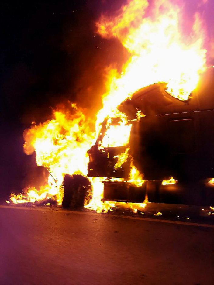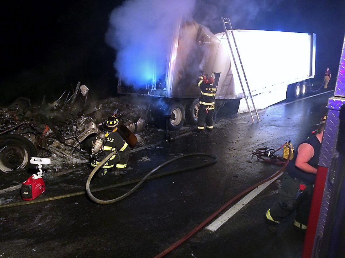 The rig was near the nine-mile marker about 9:20 p.m. when state police said driver Christopher J. Boggs of Black Rock, Ark., heard a noise and then saw flames coming from the truck. Boggs pulled over to the right side of the highway and jumped out of the vehicle.