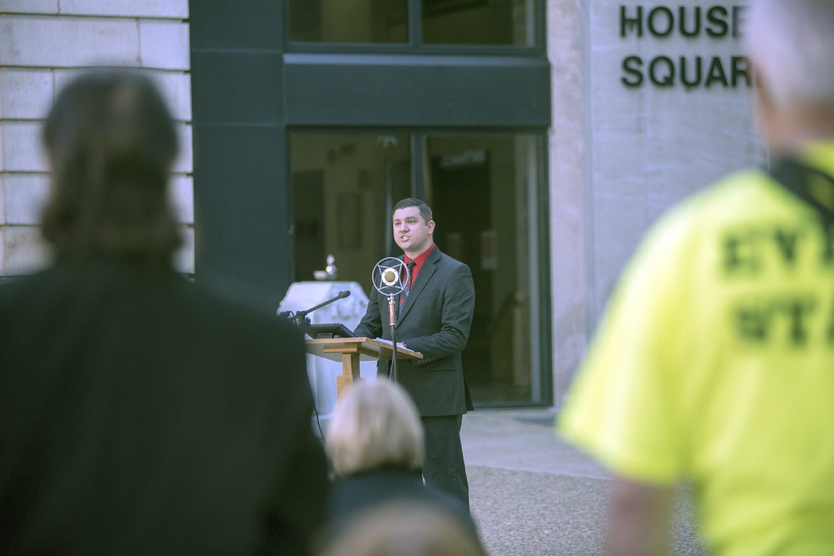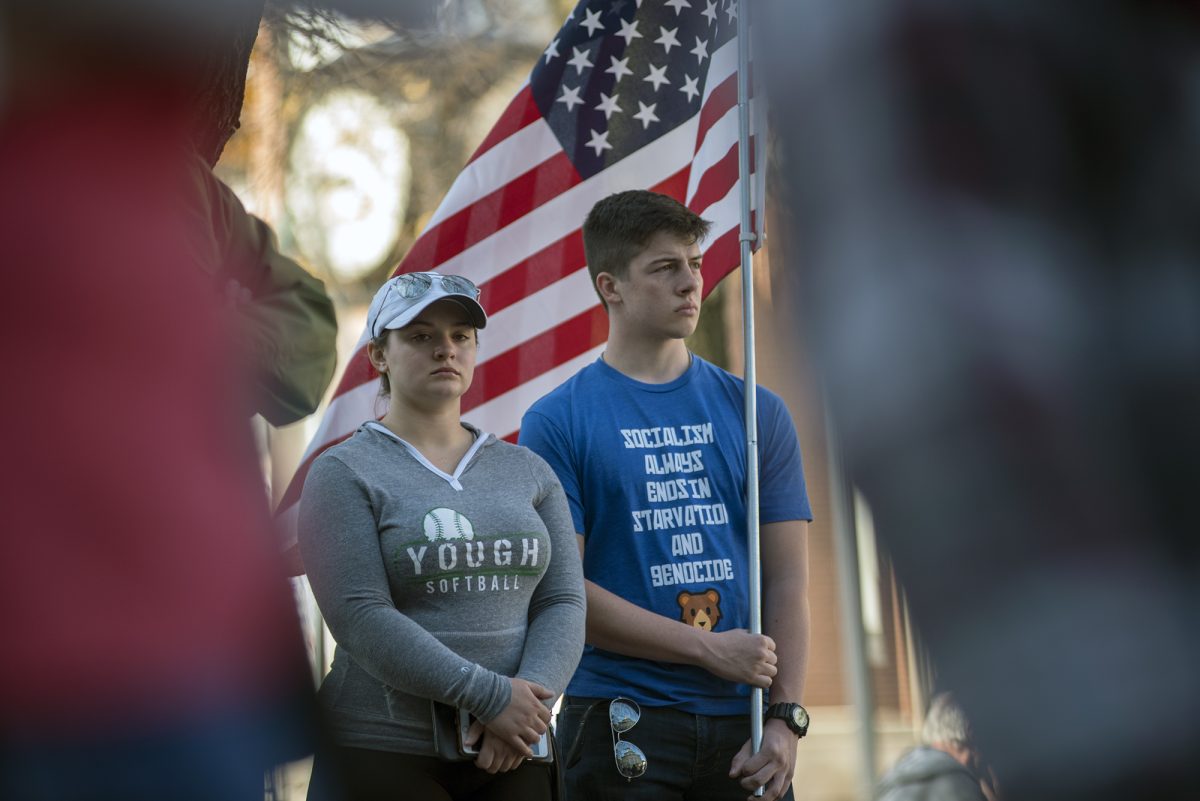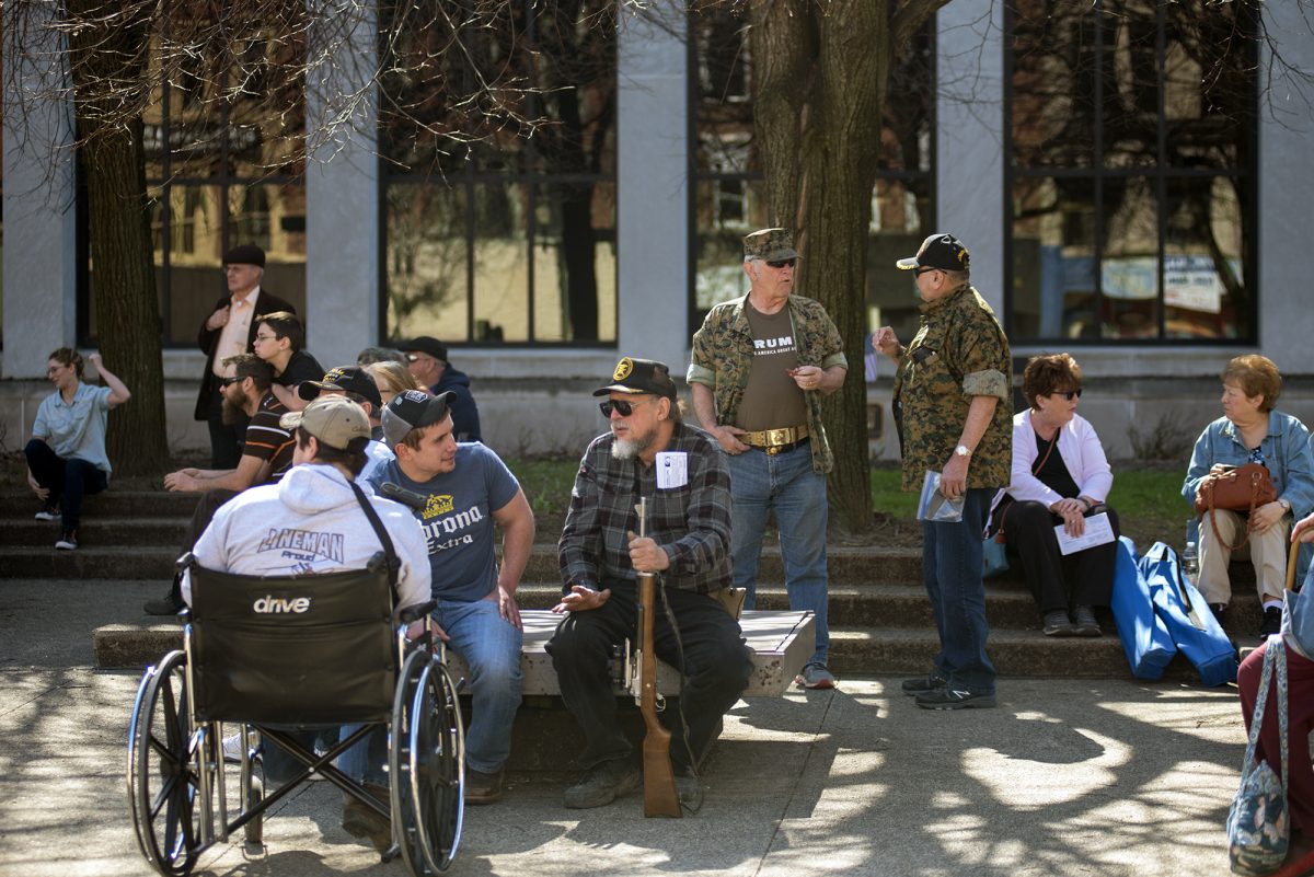 Austin Branthoover, a 17-year-old junior at Hempfield High School, spoke at the rally, saying Palla’s treatment as he exercised his rights was uncalled for. Branthoover said he disagrees with fellow students trying to take away gun rights. He said many students were shamed into marching in the earlier rallies, saying it was supposed to have been a memorial for Parkland, Fla., students.