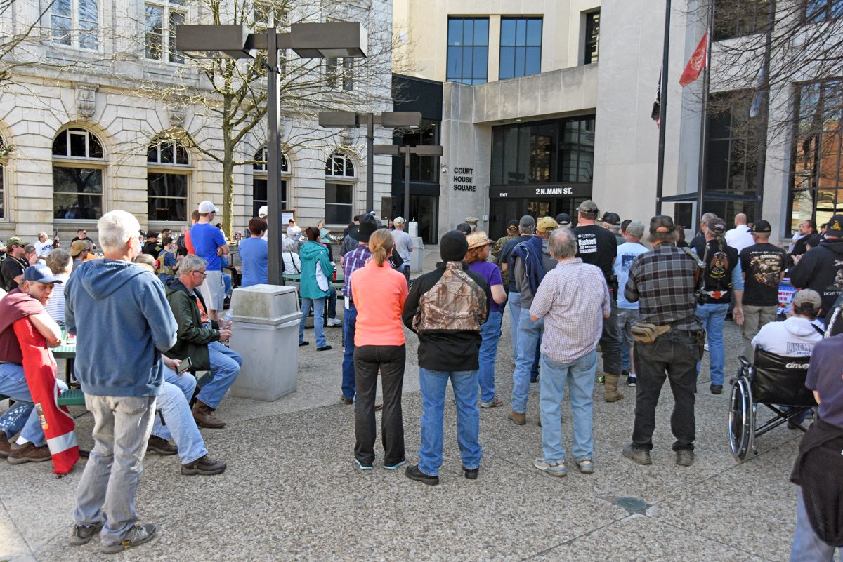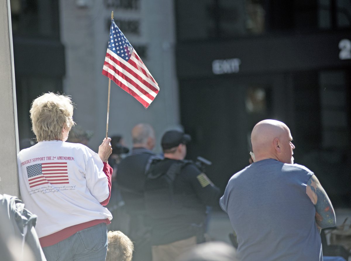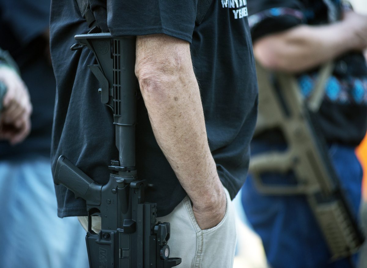 Several hundred people gathered in the courtyard next to the courthouse, many carrying their own assault-style rifles or with handguns strapped to their waists or legs. When asked for a show of hands Sunday as to who were there with guns, the vast majority raised their arms to indicate they were carrying weapons.