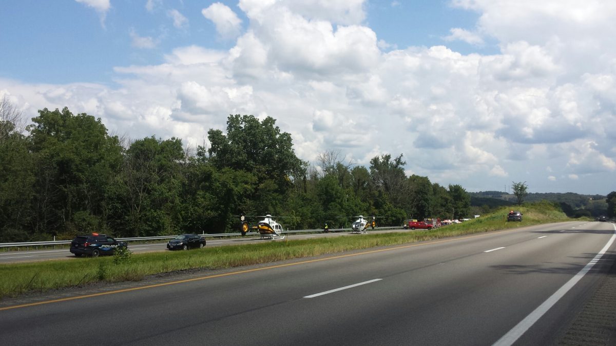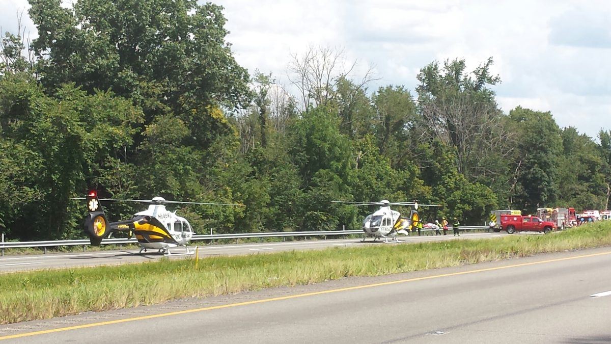 Two helicopters landed on the interstate, shutting down the westbound lanes for hours. The vehicle reportedly rolled over multiple times.
