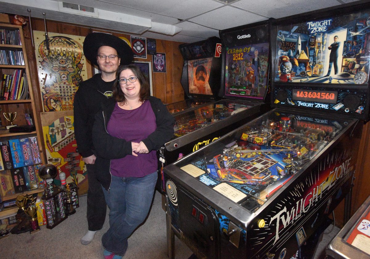 Pete and Virginia Hendricks in the pinball room at their home in Canton Township