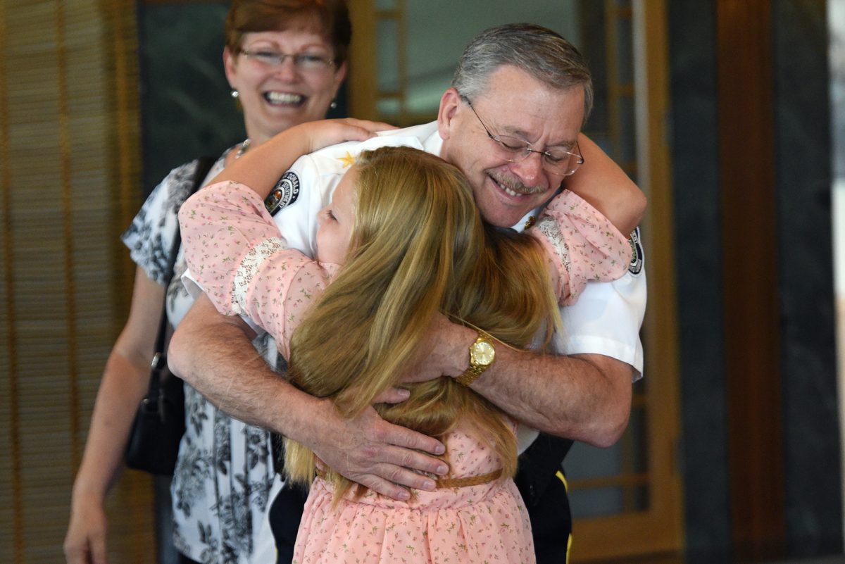 McDonald police Chief Mark Dorsey is hugged by his granddaughter, Avrey Rado, 9, as he walks into a surprise retirement party held in his honor.