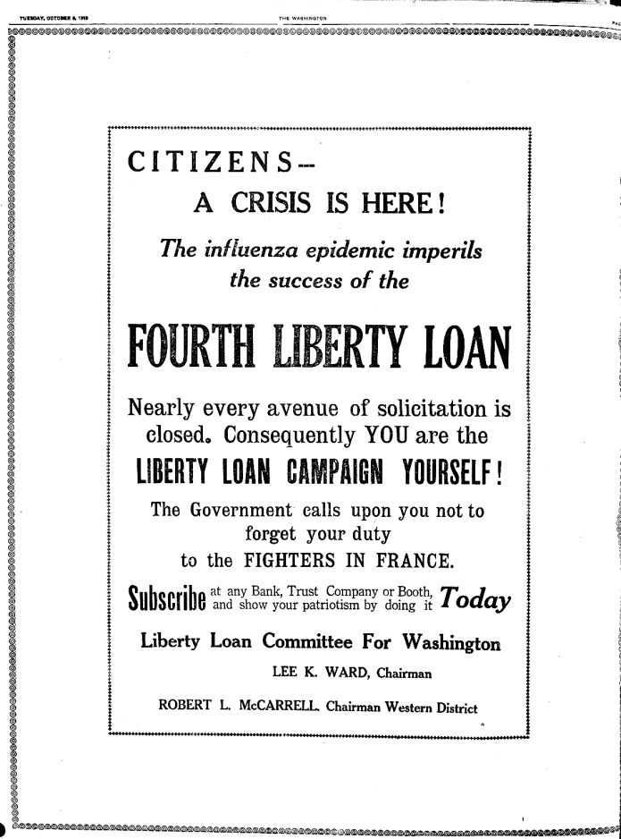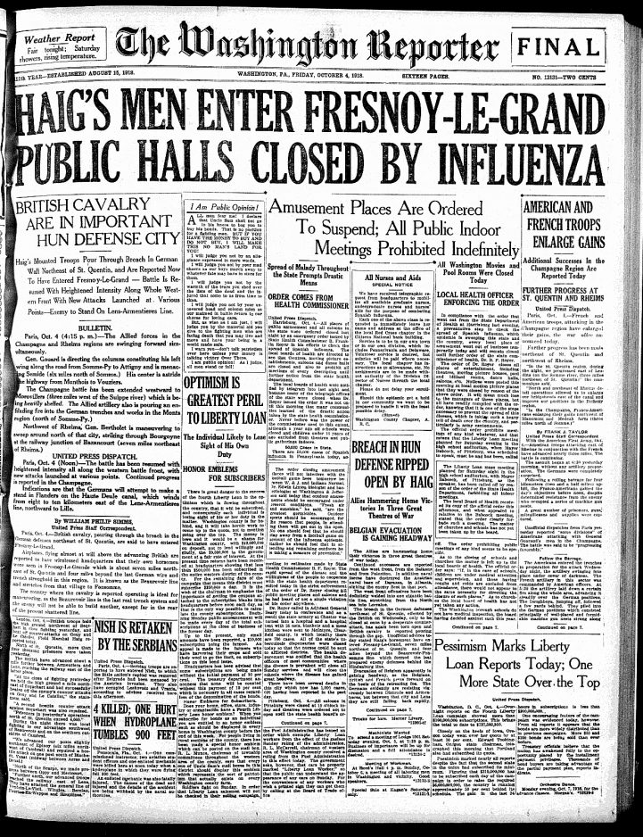 Despite the stern warning from the State Health Commission, the flu had yet to fully manifest in Washington at the beginning of October 1918. The Washington Reporter noted closing the moviehouses and taprooms would “mean much loss to the managers of these places, but all have readily complied with the order, knowing that it is one of the steps necessary to prevent the spread of the disease, which is taking such a heavy toll of death around the country.”