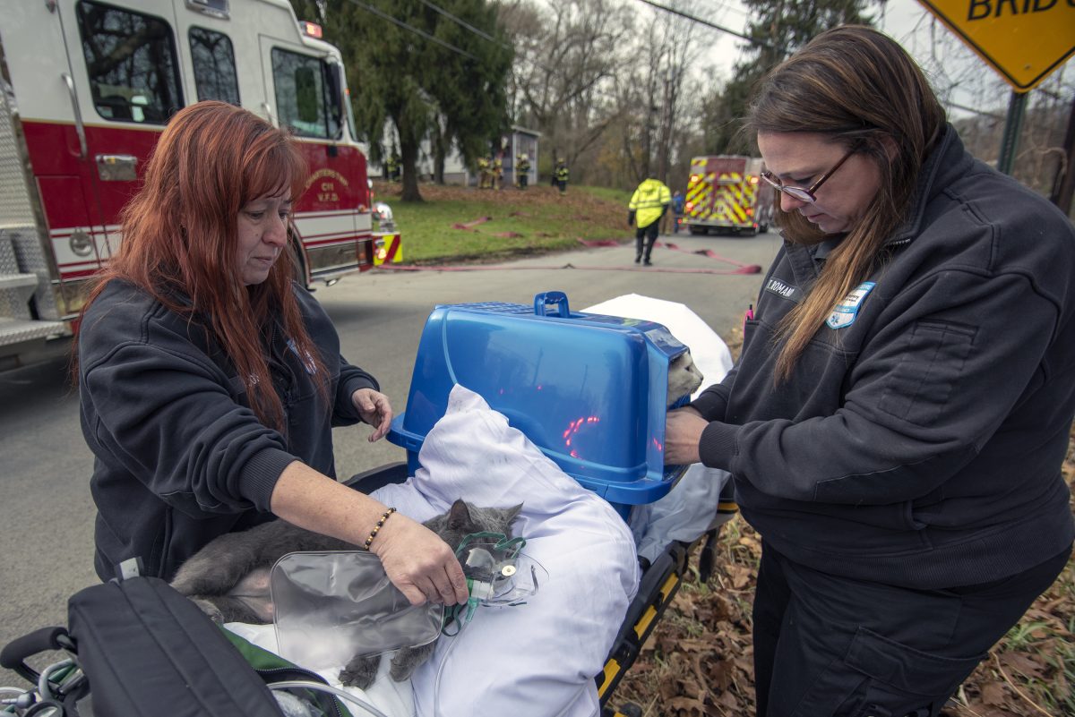 First responders from Fort Cherry Ambulance and Canonsburg Hospital Ambulance Service give oxygen to a cat rescued from a house fire Wednesday in Chartiers Township.