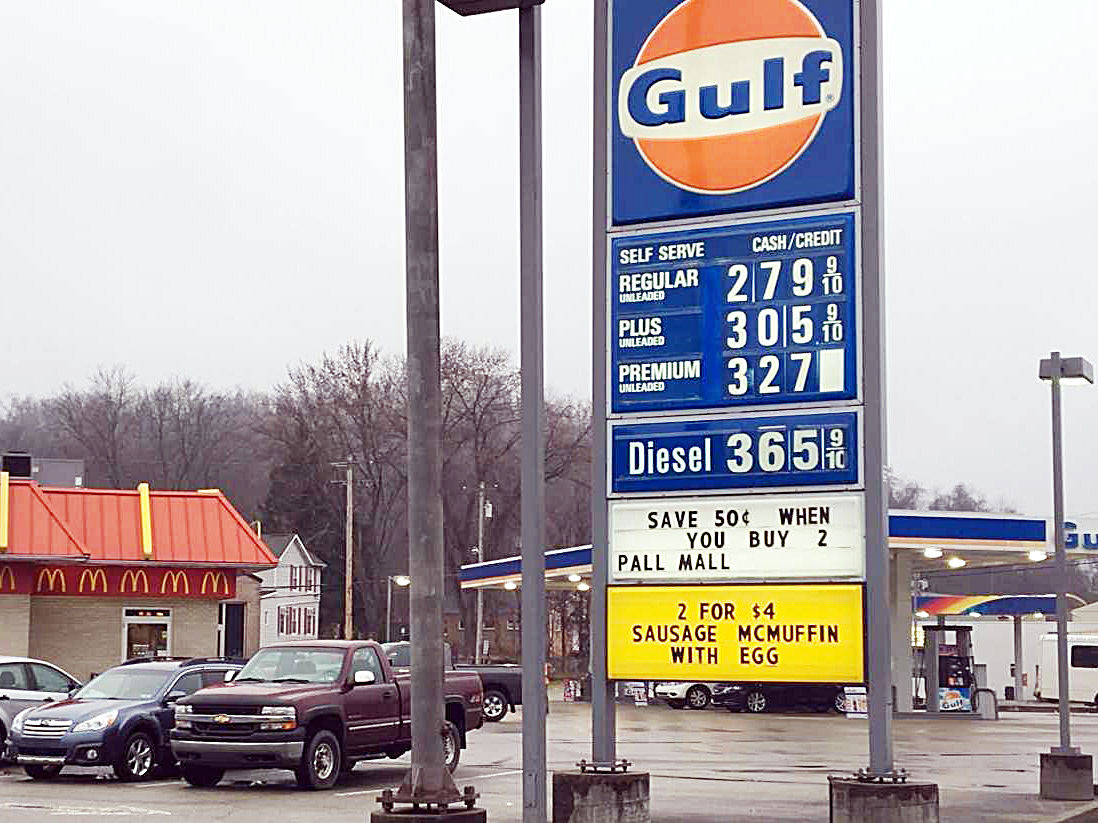 Locally, as of Monday, gas prices ranged from $2.81 to $2.97 per gallon in Uniontown, $2.85 to $3.05 per gallon in Rostraver Township, $2.79 to $2.89 per gallon in Perryopolis, $2.85 to $2.93 per gallon in Canonsburg and $2.78 to $2.79 per gallon in Waynesburg.