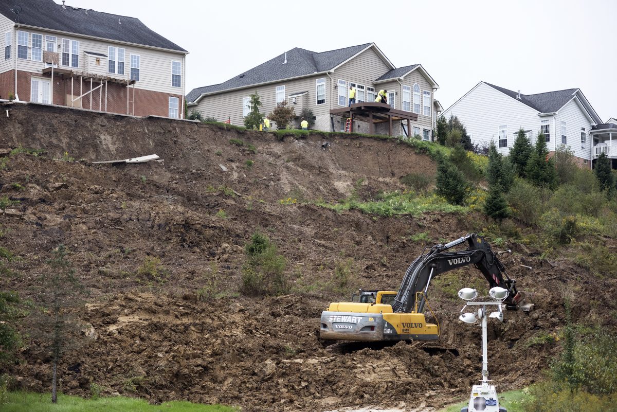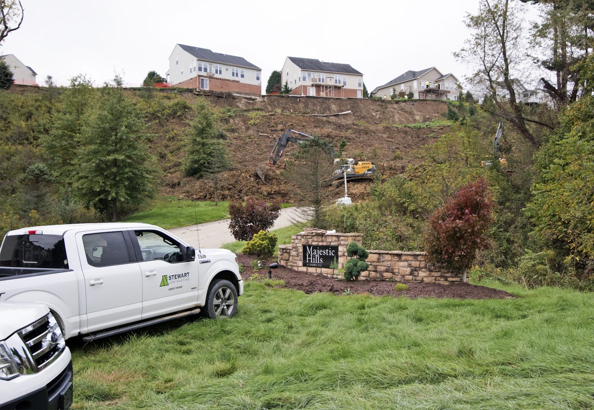 The slide in the land near Oakwood Lane in North Strabane Township’s Majestic Hills housing plan caused township officials to close one lane of the road indefinitely Thursday night. Homes were demolished Friday. The township has been dealing with the slide, which caused three homes to be condemned, since June. Joe DeNardo, part owner of the development corporation, Majestic Hills LLC, was ordered in late September by the state Department of Environmental Protection to clean and stabilize the second slide.