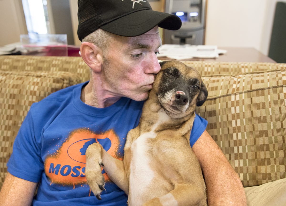 Marty Goodrich gives his dog, Cindy Lou, a kiss at Candlewood Suites Hotel in Meadow Lands on Tuesday. Cindy Lou is recovering from injuries suffered in a recent house fire.