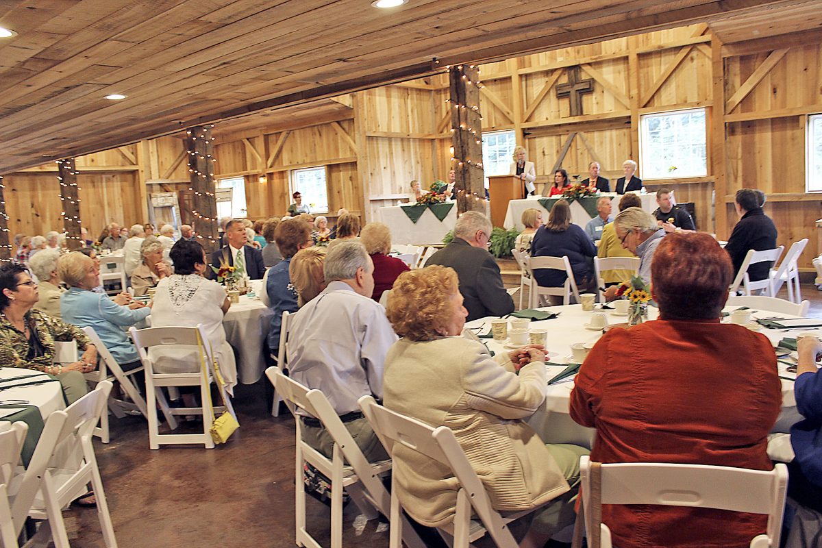 Audience members listen to Leslie Grenfell, at podium, executive director of Southwestern Pennsylvania Area Agency on Aging, as she kicks off Greene County’s first Elder Justice Day Thursday at Valley View Farm outside Waynesburg.