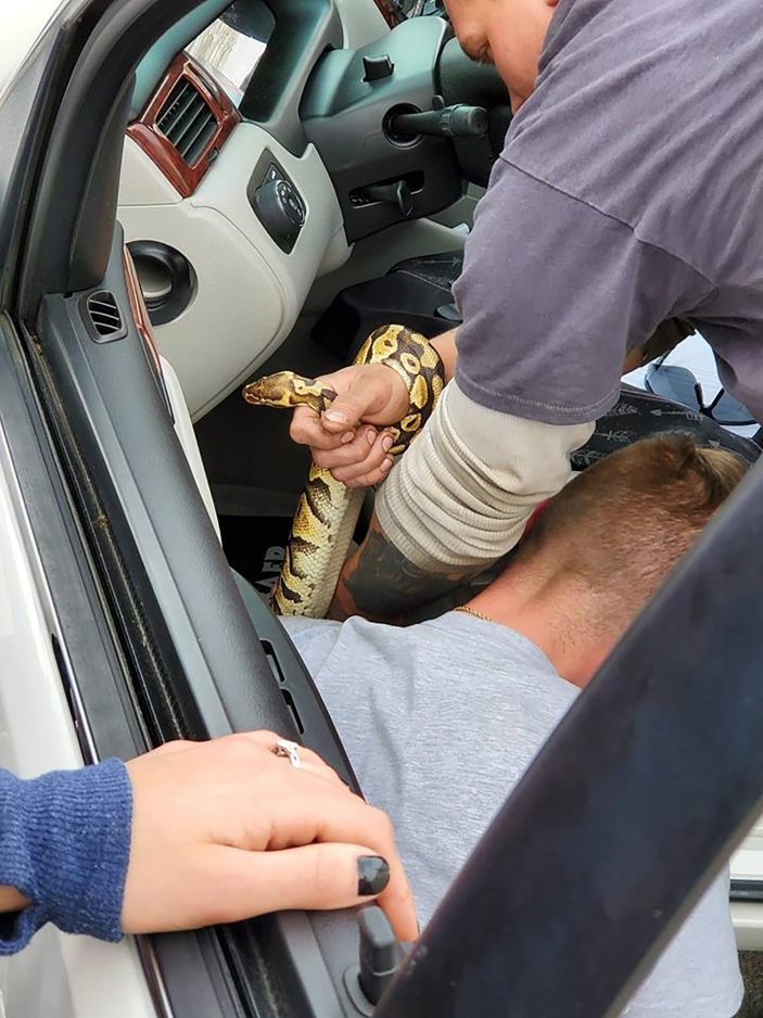 But that didn’t stop two mechanics at Washington’s Budd Baer Inc. from putting their longtime love of snakes and other-cold-blooded creatures to good use on Thursday when a driver asked for help getting her pastel python, Rosco, out from under a seat in her car.