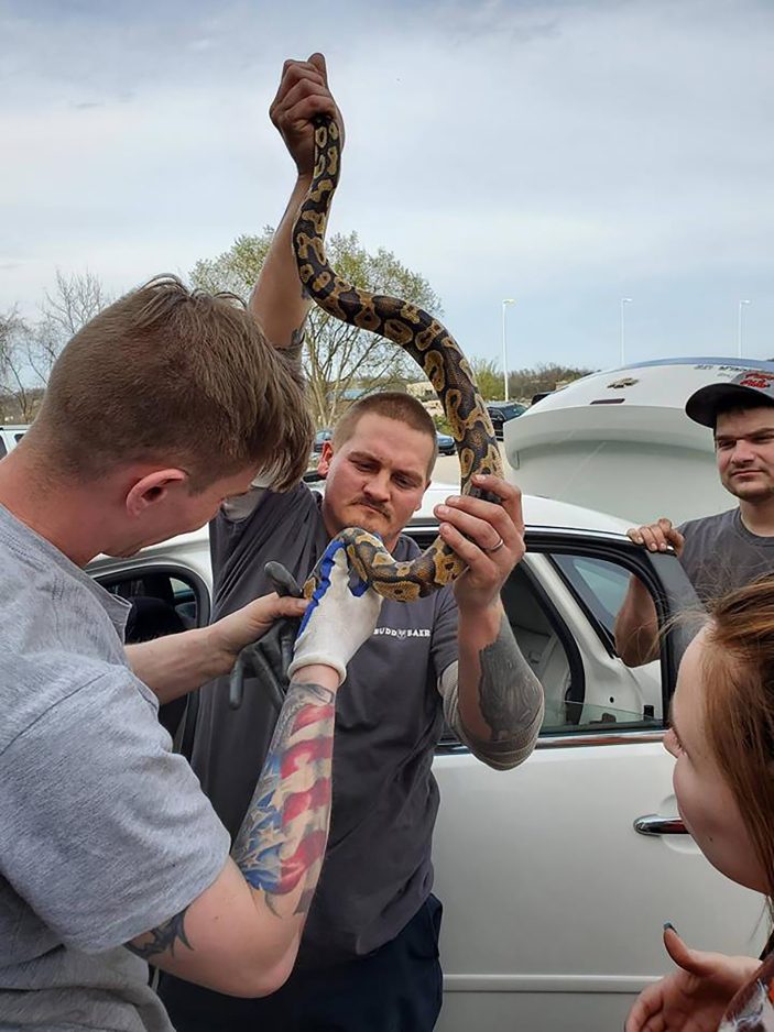 Rush’s fellow reptile handler, Bobby Byers, 31, of Washington, services Mazdas at the dealership. He joined in the snake rescue.