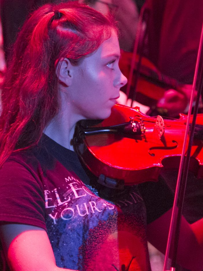With that, he demonstrated the six-note sequence on his electric violin, and soon the orchestra members were following suit.