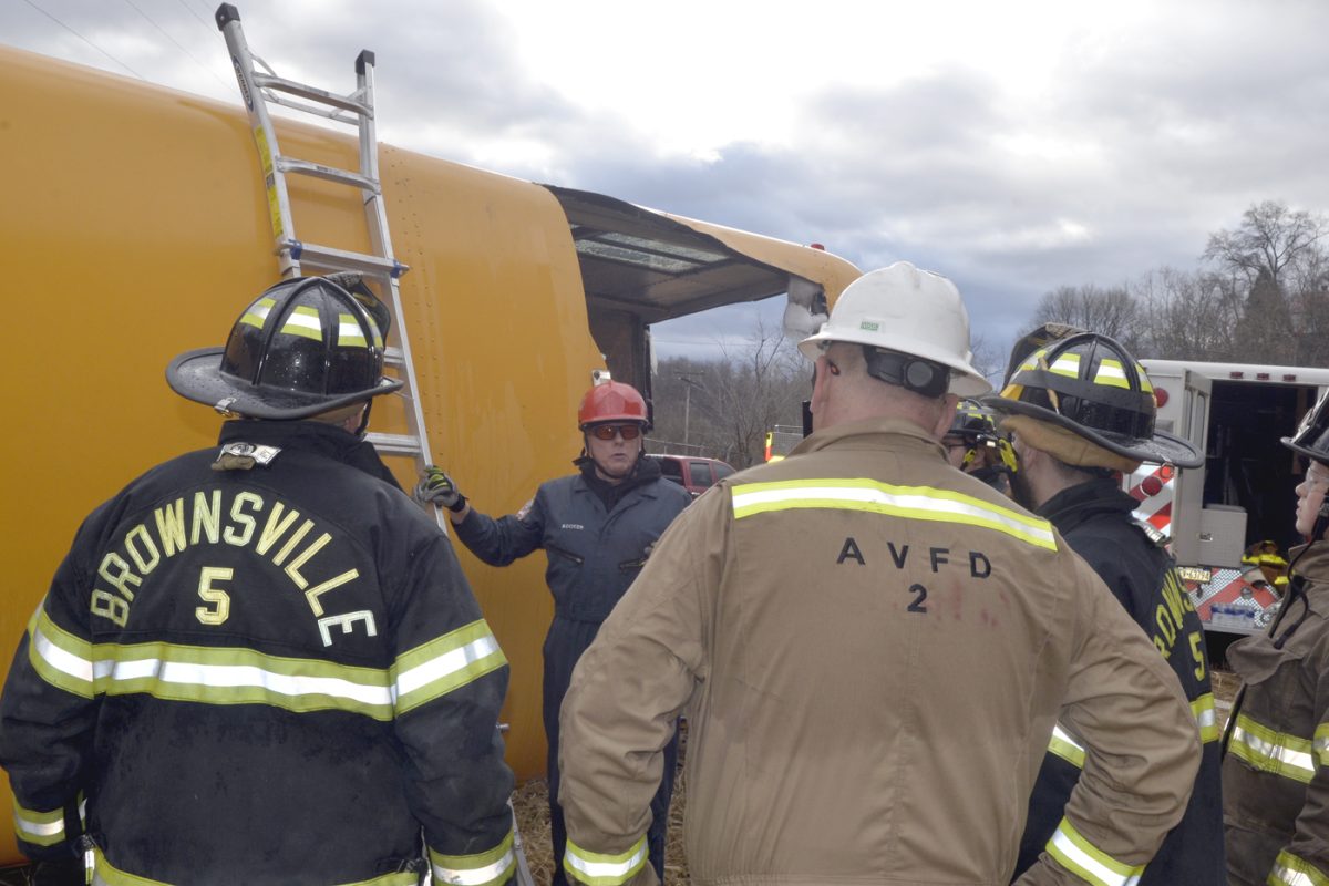 What was in front of them left little to the imagination: a 66-passenger school bus flipped on its side near the bus garage off Brownsville Avenue, empty and donated by Mlaker Transportation to allow them to learn how to conduct a bus rescue operation.