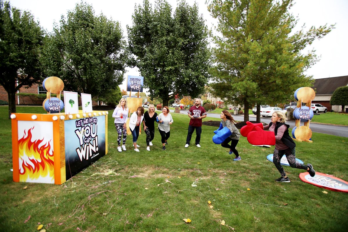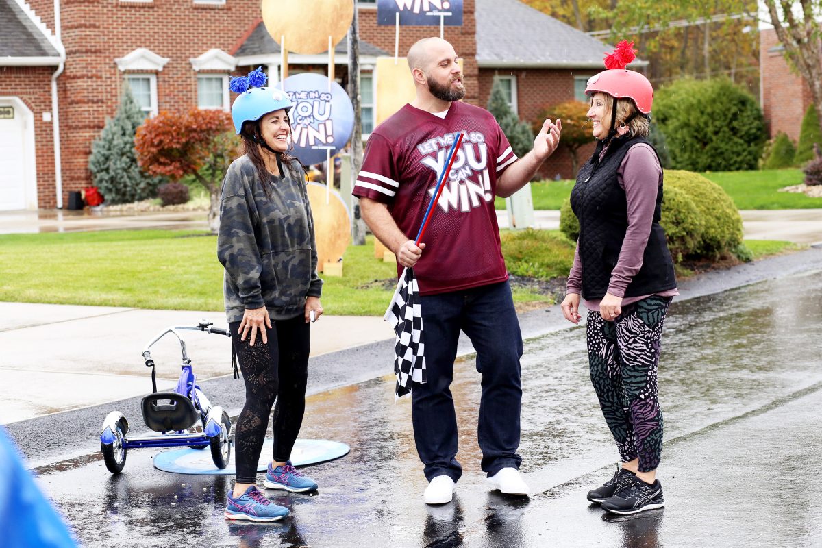 The women also competed in a tricycle race where they had to ride the trikes along a course – while neighbors and friends squirted them with super-sized water guns and pelted them with water balloons – and retrieve a key with their teeth from a giant bowl of Honey Nut Cheerios, then return to the start of the race.