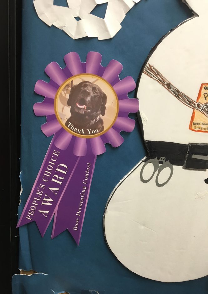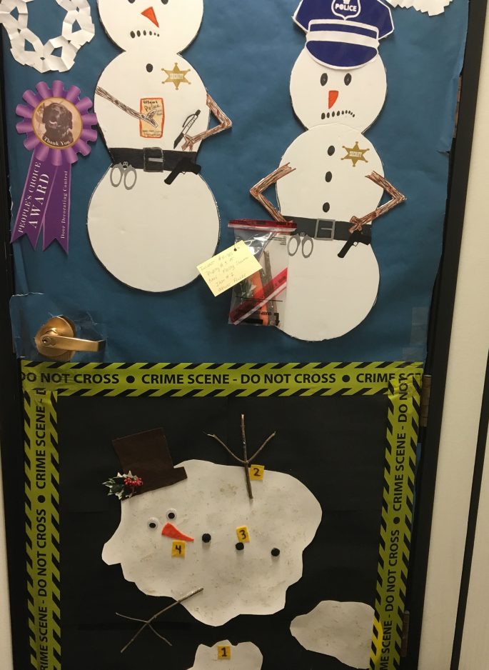 Washington County government offices in the courthouse and Courthouse Square building competed in an annual door decking contest, and the winner of the peoples’ choice award was the sheriff’s office depicting a crime scene investigation into the fatal meltdown of Frosty the Snowman. Perhaps the unseasonably warm weather was the obvious suspect, but sticks and a carrot were bagged as evidence. All winners received a ribbon and bark of approval from sheriff’s department K-9 Officer Obie. The first-place winner, as determined by the judges, was the Washington County Domestic Relations office.