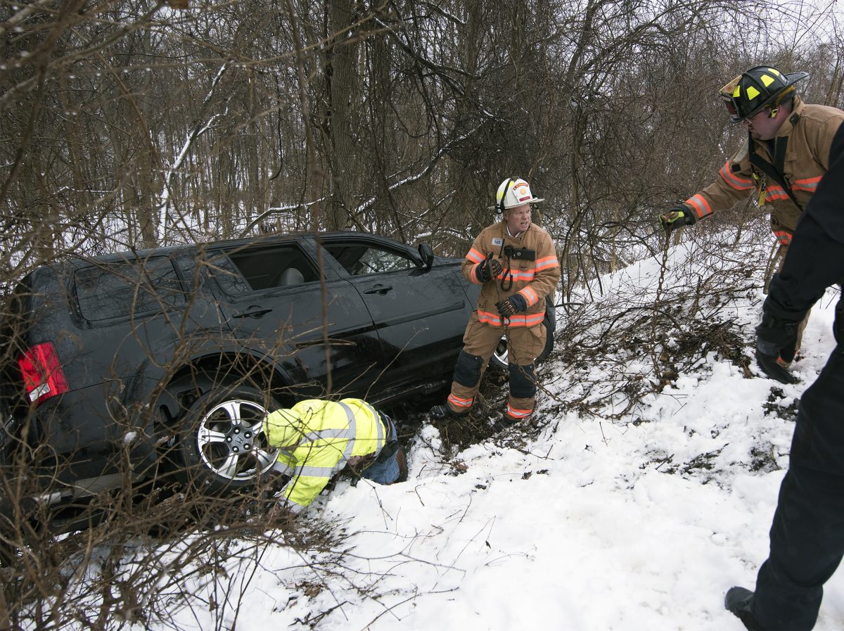 South Strabane fire Chief Scott Reese said the woman was the only one in the car when she lost control on a curve on Route 136, slid through the snowy parking lot of Beau Mart and went over an embankment, where her vehicle got stuck.