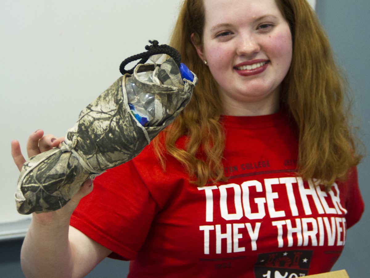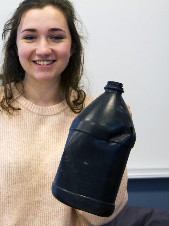 Lily Bonnasso displays a water jug found near the southern border, colored black to help prevent detection.