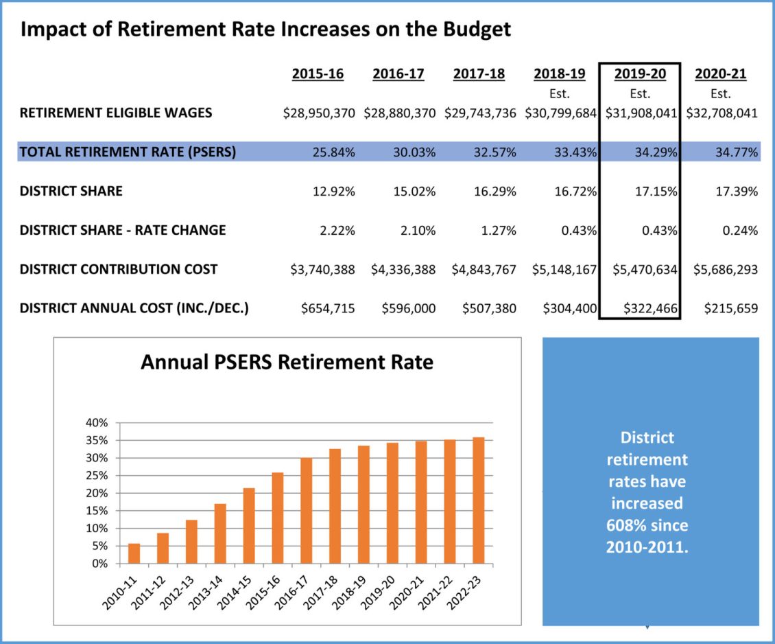 Salaries will increase $1.11 million, or 3.6 percent, over 2018-2019, and the district’s obligation to the Public School Employees’ Retirement System rises by $644,933. Pension costs have increased from 3.6 percent of the district’s operating expenses in 2007-2008 to 16.02 percent in 2019-2020, the preliminary budget states.
