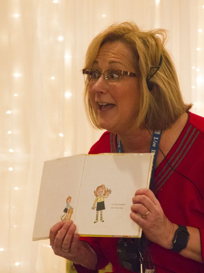 Nicole Harding, library youth services coordinator, reads a book to children during the celebration.