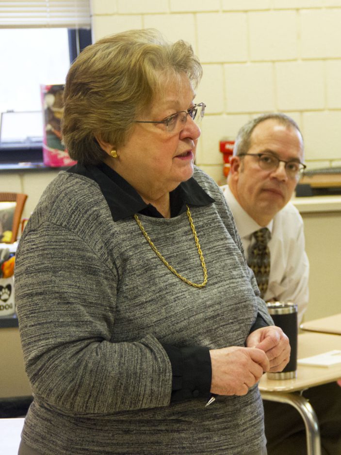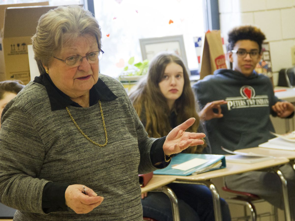 Matthew Cheran listens as Noretta Willig speaks to his Peters Township Middle School students.