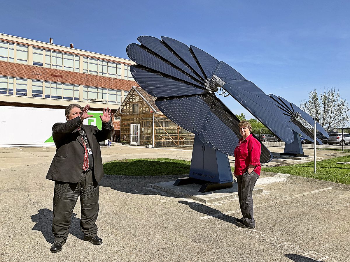 Snoke gave one example of how students will use the solar flowers: Students will place less technologically sophisticated solar panels alongside a SmartFlower and a small wind turbine, capture energy output into batteries and place outlets outside so people can plug in and power up devices such as weed trimmers.