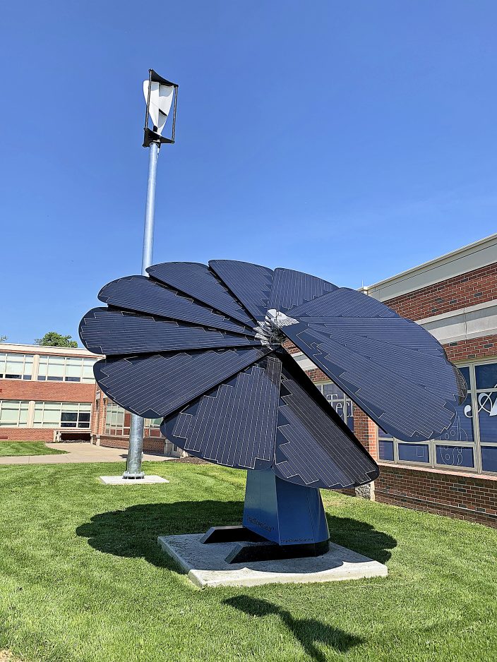 A 30-foot horizontal turbine and two SmartFlower solar systems are located behind the school, while a 35-foot vertical turbine and another Smartflower are in front.