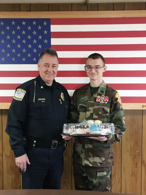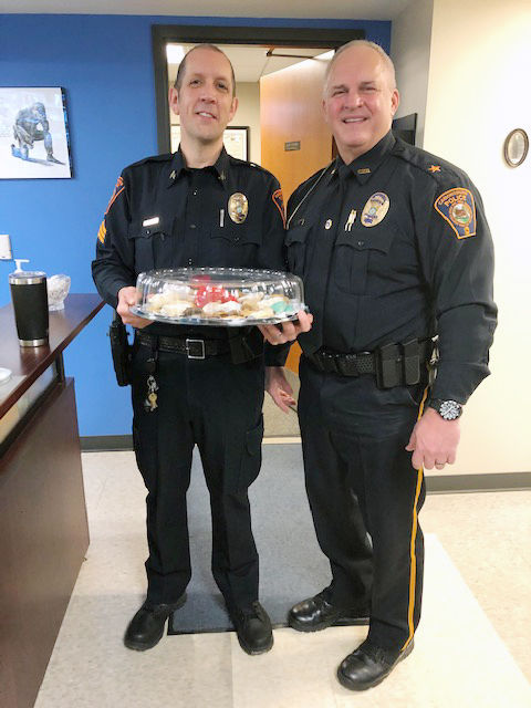 In a show of appreciation, the Washington County Young Marines and staff delivered 26 cookie trays last month to first responders in Washington and Greene counties. Pictured are Canonsburg Police Department Sgt. Loren Cochran and Chief Al Coghill. The cookies were delivered by Don Bailey, Young Marines unit commander. In the second photo, Young Marine Sgt. Jason Pomponio presents a cookie tray to Paul Brand, Carroll Township chief of police.