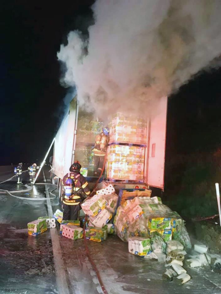 A tractor-trailer hauling a full load of paper towels caught fire Tuesday night on Interstate 70.