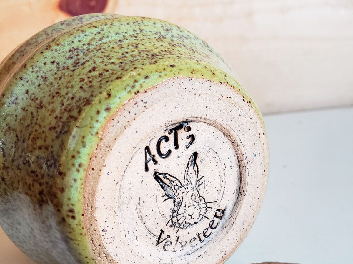 The undersides of the comfort cups also feature the logo for the Velveteen Artisan, Rebekah’s home pottery business.