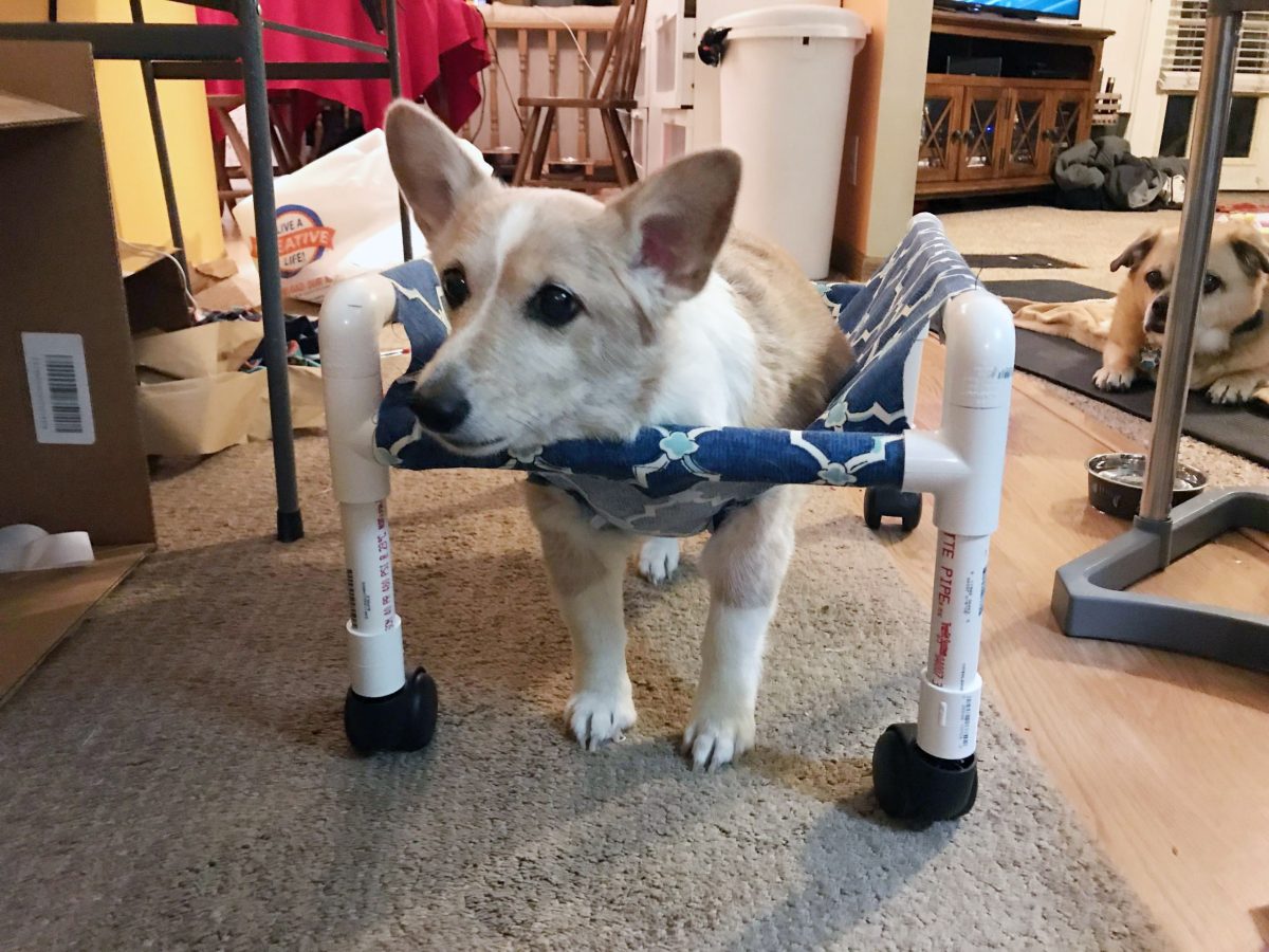 Penni started walking again on Feb. 21, 2019. She heard Holly scooping food in the next room and took a few steps in that direction while barking loudly for tasty reinforcements. After that, she steadily regained movement, and was 100% by May.